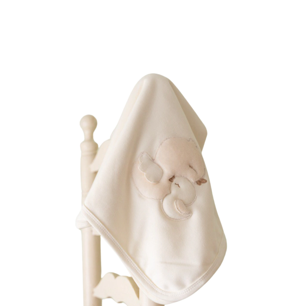 Esta manta de algodón doble en color natural destaca por su adorable osito en tonos blanco, marrón y beige. Con un diseño reversible y bordada en ambos lados, es perfecta para cualquier ocasión.