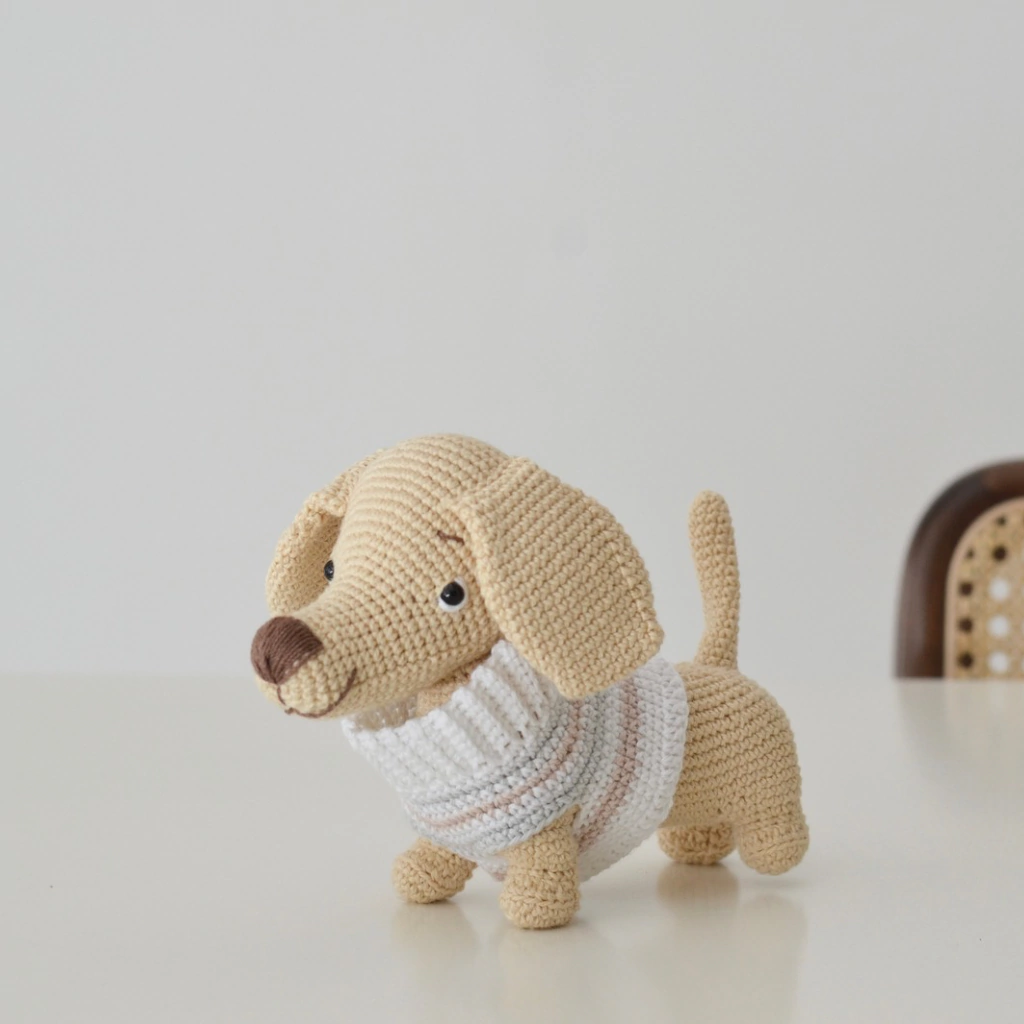 Descubrí al Perrito Salchi I, un encantador perro salchicha tejido a mano en hilo al crochet. Su color arena combina perfectamente con el chalequito blanco con detalles es beige y gris, dándole un estilo único y delicado.